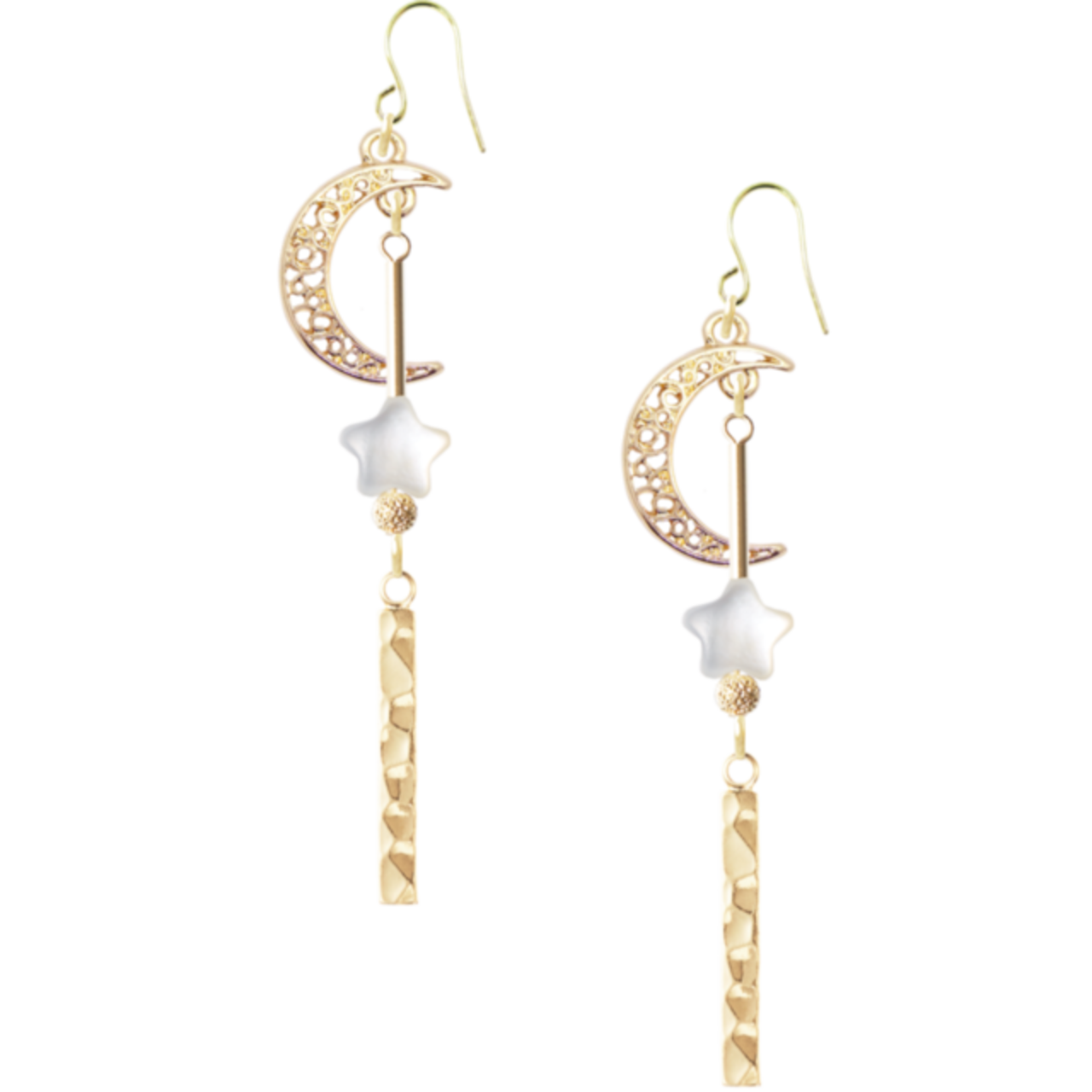 透かし三日月に星型のホワイトシェル、さらに水面デザインのメタルバーが組み合わさった美しいピアスです。明るい夜の海をイメージし、清涼感あふれるデザインが特徴です。耳元にほんのりとした華やかさを加え、特別なコーディネートにぴったりのアイテムです!